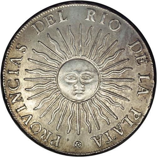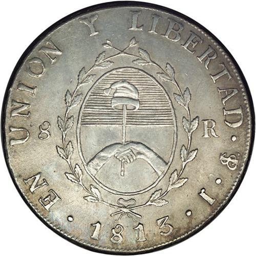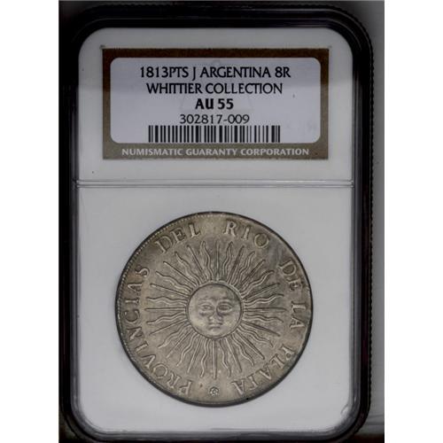<B>Rio de la Plata. 8 Reales 1813J-PTS, </B></I>KM5, AU55 NGC, a choice, problem-free coin with light gray toning and attractive, boldly defined details.