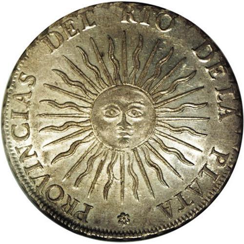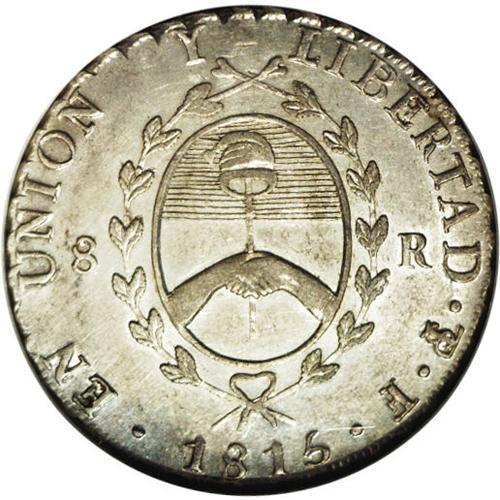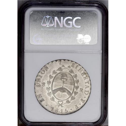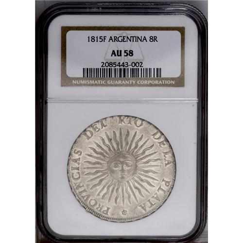 <B>Rio de la Plata. 8 Reales 1815F-PTS, </B></I>KM14, AU58 NGC, an extremely attractive example with well-struck details, frosty mint luster and no planchet flaws. Ex-Heritage World Coin Auctions, January 2004, lot 12320, Morris Geiger Collection.<BR><I>From The Rio De La Plata Collection.</B></I>