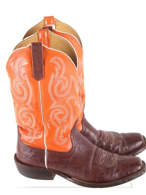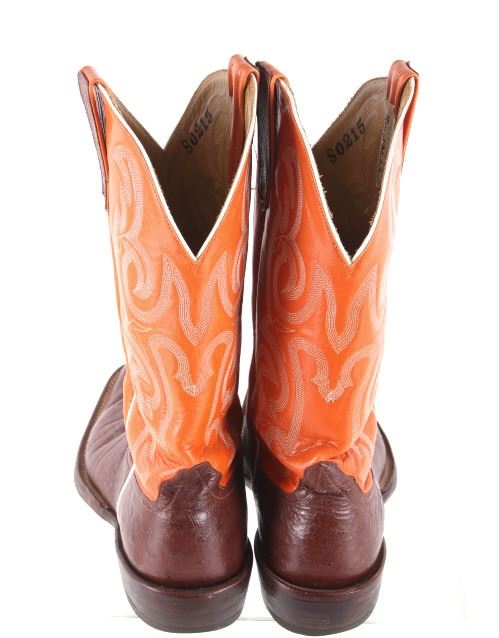 Featured in this lot are these genuine smooth ostrich boots from Mercedes, Texas from Rios of Mercedes. The boots feature two layers of genuine smooth ostrich leather and are orange colored with western patterns sewn into the side walling of the boots. The boots have slick soles and a size of 9 1/2 - 10 B. The condition of this pair of boots is good, with some wear consistent with the age of the boots and no obvious signs of damage. The measurements of this pair of boots are 13 1/2" x 12 1/4" x 4 1/2".