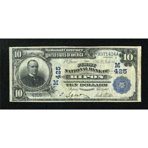 <B>Ripon, WI</B></I> - $10 1902 Date Back Fr. 616 <B>The First NB</B></I> Ch. # (M)425<BR> This note is a nice looking pen signed example from the community commonly credited as the birthplace of the Republican Party. The colors are still bright on this evenly circulated <B>Fine</B></I> $10.<BR><BR><b>Shipping:</b> Coins & Currency (<a target="_blank" href="http://www.heritageauctions.com/common/shipping.php">view shipping information</a>)