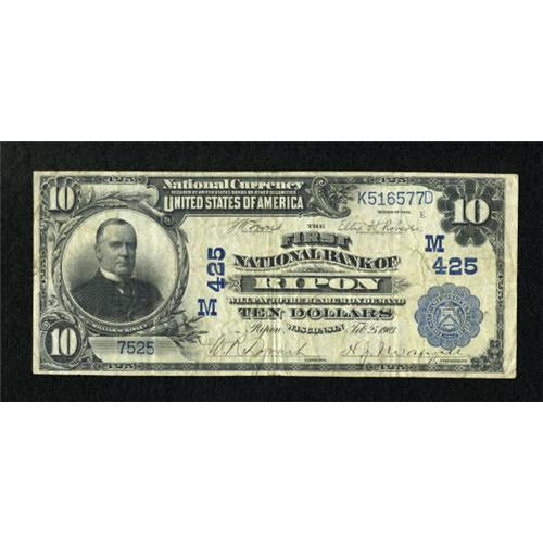 <B>Ripon, WI</B></I> - $10 1902 Plain Back Fr. 624 <B>The First NB</B></I> Ch. # (M)425<BR> The delicate black pen signatures of Cashier W. R. Dysart and Vice-President H. J. I. Waxwell definitely add to the appeal of this piece. While it technically grades <B>Fine</B></I> or a bit better, it faces up quite nicely and is held back by some wallet soiling on the back.<BR><BR><b>Shipping:</b> Coins & Currency (<a target="_blank" href="http://www.heritageauctions.com/common/shipping.php">view shipping information</a>)