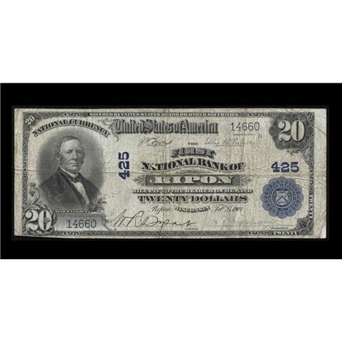 <B>Ripon, WI</B></I> - $20 1902 Plain Back Fr. 650 <B>The First NB</B></I> Ch. # 425<BR>Black pen signature of Cashier W.R. Dysart and a faded blue pen signature of Vice President H.J.I. Waxwell are found on this $20. <B>Fine.</B></I>