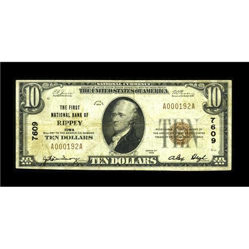 <B>Rippey, IA</B></I> - $10 1929 Ty. 1 <B>The First NB</B></I> Ch. # 7609<BR>We can find only two auction records for a small size on this bank. The first was in a 1986 Hickman and Oakes auction and the second was in a September 2000 auction. This $10 that is being offered tonight is one of 11 small in the census. However, these notes have remained in strong hands over the years, <B>Fine.</B></I><BR><BR><b>Shipping:</b> Coin/Currency (<a target="_blank" href="http://www.heritageauctions.com/common/shipping.php">view shipping information</a>)