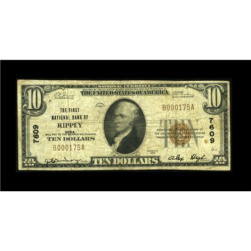 <B>Rippey, IA</B></I> - $10 1929 Ty. 1 <B>The First NB</B></I> Ch. # 7609<BR>While this bank, which was the sole issuer in this small Greene County community, printed a total of six different types and denominations in small size, just 11 of those notes are included in the Kelly census, including this <B>Very Good</B></I> offering.