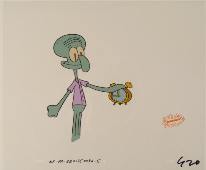 This original animation cel is from the Nickelodeon TV show SpongeBob Squarepants. The story takes place under the deep blue sea in Bikini Bottom, where SpongeBob resides. SpongeBob, who is a yellow, porous sponge, is your typical happy-go-lucky character, as he is always cheerful and enjoys making people laugh. Patrick Star, SpongeBob's neighbor who is a starfish, is your average children's show idiot, as he boasts knowing nothing and is often getting himself into ridiculous situations. Between the homes of these two lies the home of the miserable Squidward, a squid, who is known for being grouchy and playing tricks on SpongeBob and Patrick. Both SpongeBob and Squidward work at the Krusty Krab, a fast food business run by the greedy money-loving Mr. Krabs, a crab, the arch rival of the evil, possibly misunderstood, Plankton. Another neighbor, Sandy Cheeks, an athletic squirrel who normally wears an astronaut's space suit, was introduced in "Tea at the Treedome." She spends most of her time inventing and experimenting. In this cel Squidward looks like he's ready to rise and shine with his morning alarm.. Original Production Animated Cel Overall Size of Cel: 10 1/2" x 12 1/2" Excellent ConditionThis is an original hand-painted cel set-up used in the production of an episode of "SpongeBob SquarePants." Each one-of-a-kind set-up represents a slight change in position of the characters. When individually photographed and projected in rapid succession, the images appear to move.