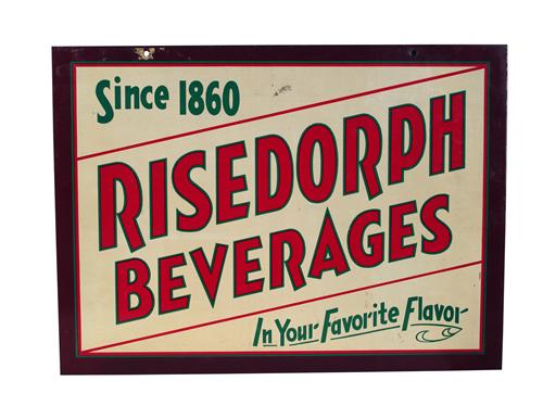 Risedorph Beverage metal 2-sided sign vg cond 18 x 24 "