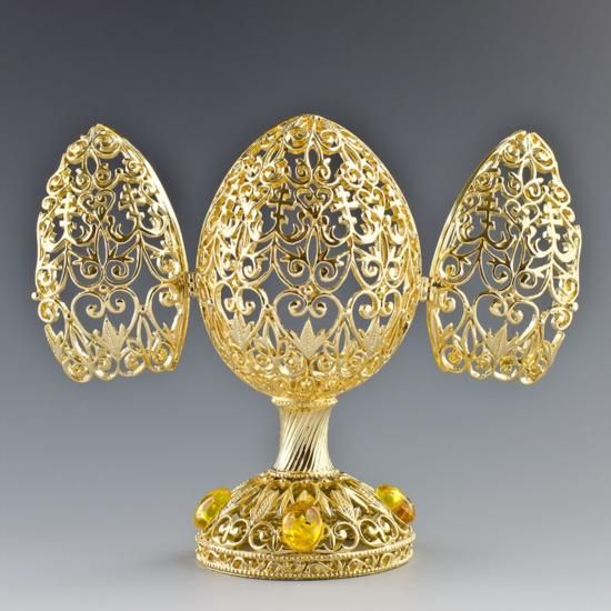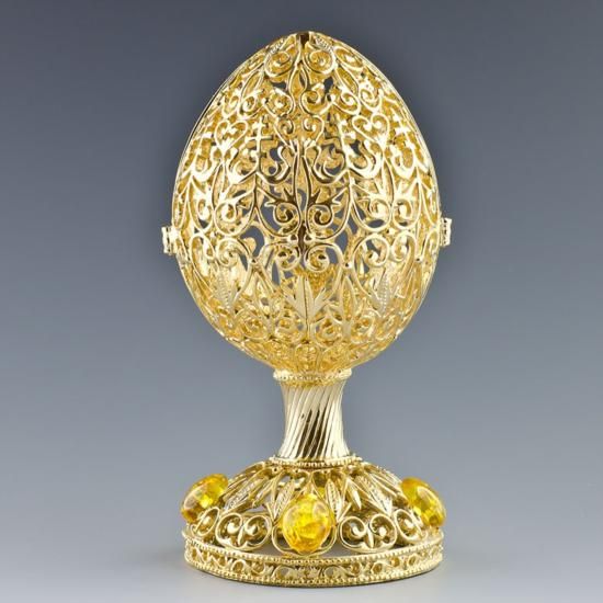 Rising Cross Faberge Egg, Dimensions: 5in (H) X 2.5in (D), Material: Pewter. The famed Faberge eggs are jeweled eggs, often with the most ornate, minuscule designs on them. The House of Faberge made the original pieces from 1885 to 1917. At that time, they became popular gifts given during the Easter season. Larger versions were made for the Russian royal family, including Alexander III and Nicolas II. Of these, 42 of the 50 originals exist today. Most Faberge eggs, though, were much smaller and hung from a chain around the neck. These eggs have precious metals on them or gemstone decorations, often with intricate detailing. These are a symbol of luxury and thought of as individual masterpieces.