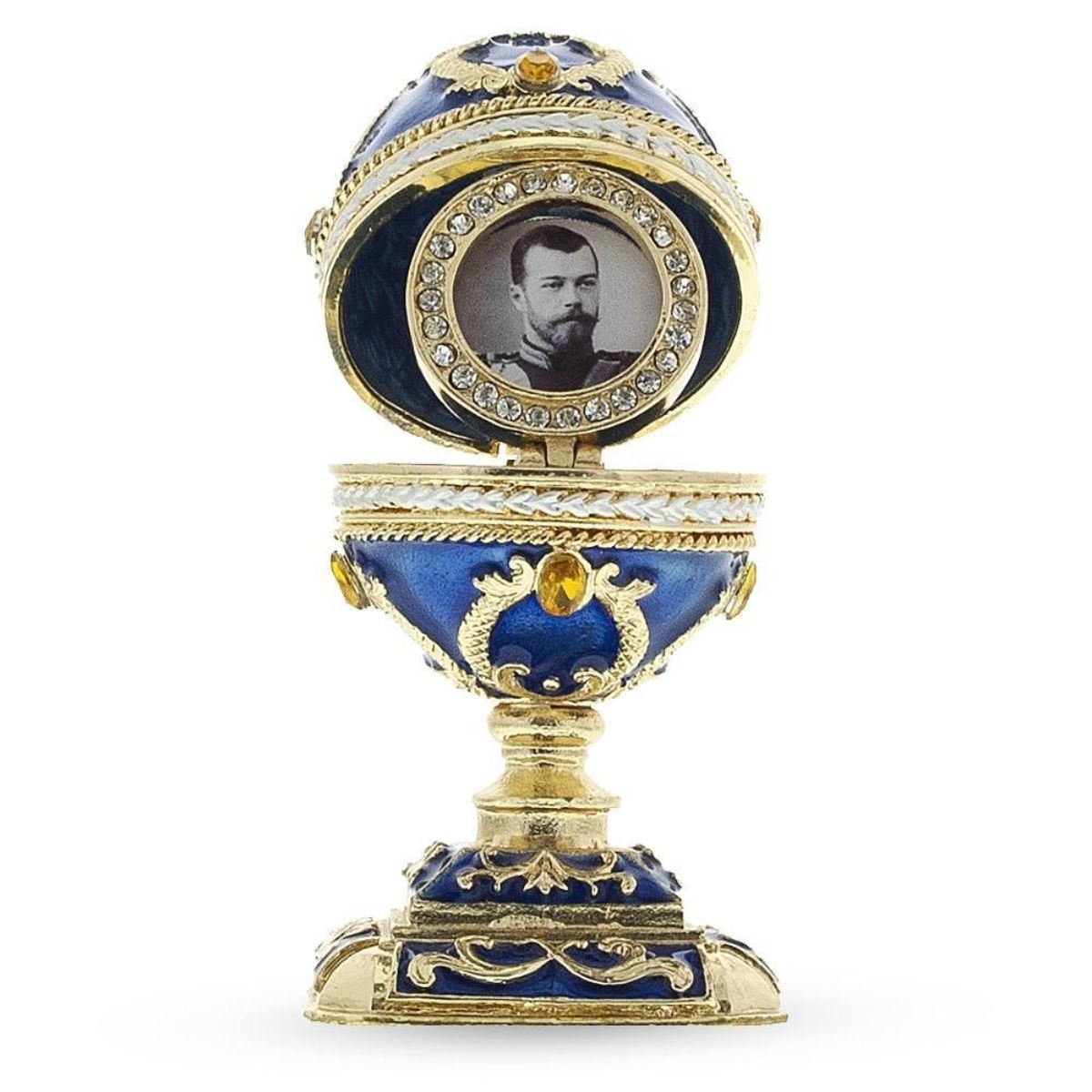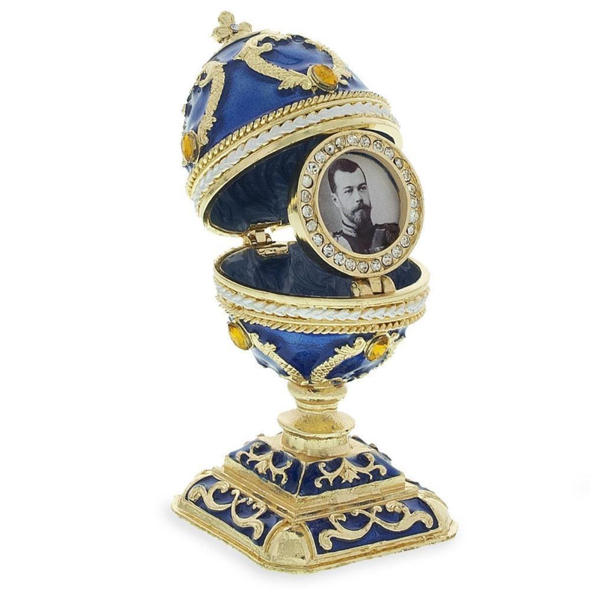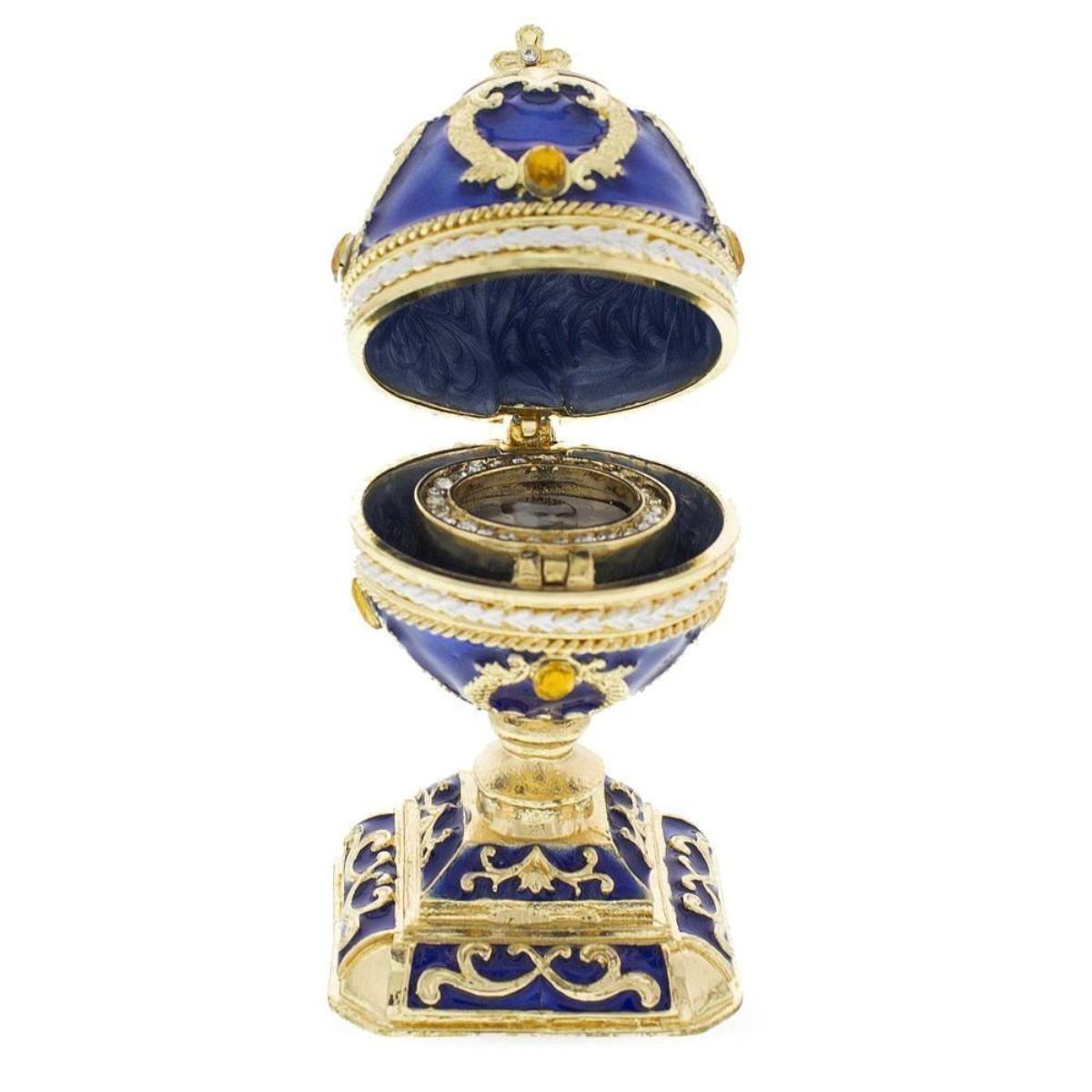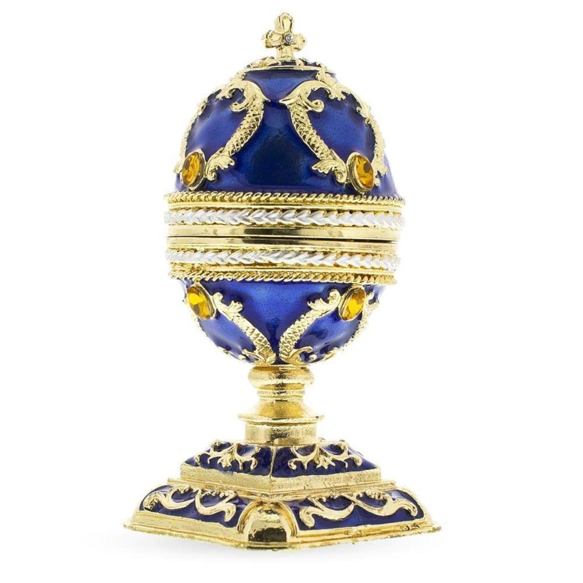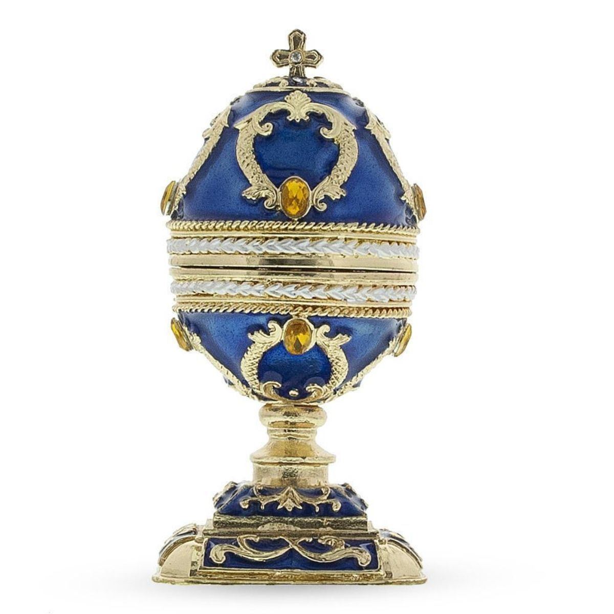 Rising Cross Green Enamel Royal Inspired Russian Egg 3.5 Inches Tall x 1.7 Inches Wide 8.89 cm Tall  x 4.318 cm Wide Enameled Gold Plated Pewter Hand Painted Gift Boxed This hand-painted sparkling egg is adorned with a high-polished green enamel with golden trim. The egg opens on a hinge and closes shut with a magnet, to keep the box securely shut. The piece comes in a beautiful gift box.