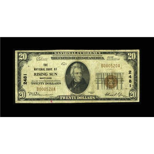 <B>Rising Sun, MD</B></I> - $20 1929 Ty. 1 <B>The NB of Rising Sun</B></I> Ch. # 2481<BR>An evenly circulated example from this very popular location. <B>Fine.</B></I><BR><BR><b>Shipping:</b> Coin/Currency (<a target="_blank" href="http://www.heritageauctions.com/common/shipping.php">view shipping information</a>)