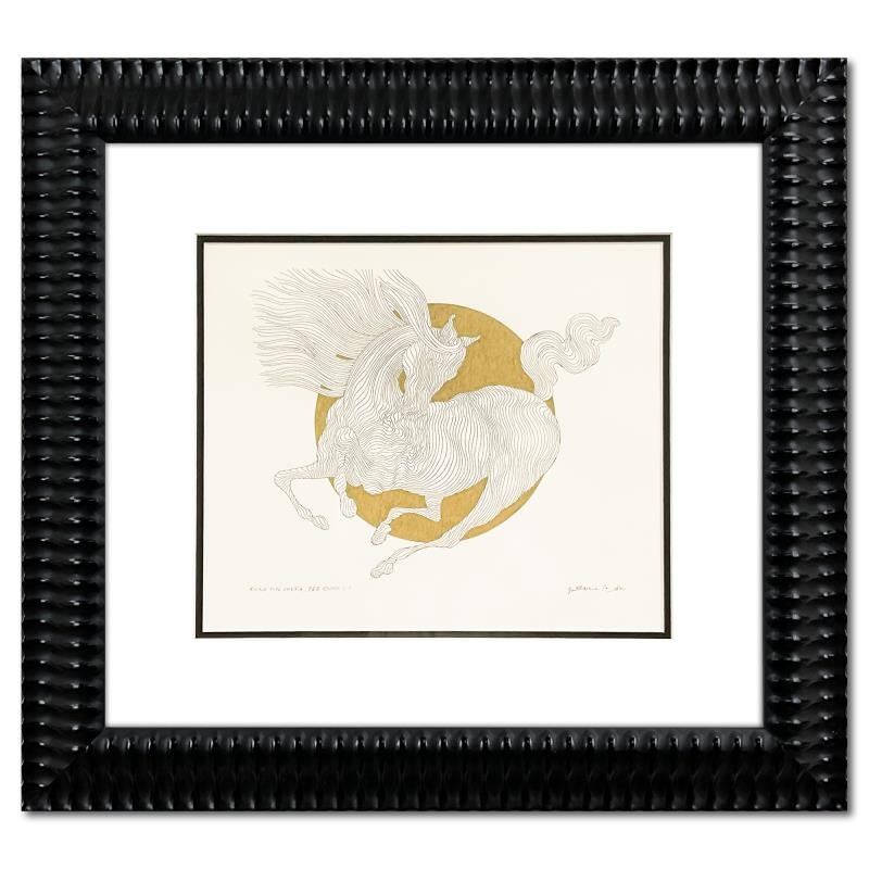 "Rising Sun Sketch BBB" is an original drawing on paper with hand laid gold leaf by Guillaume Azoulay, hand signed by the artist. This piece comes custom framed. Includes Letter of Authenticity. Measures approx. 23.5" x 21.5" (frame), 11.5" x 10" (image).