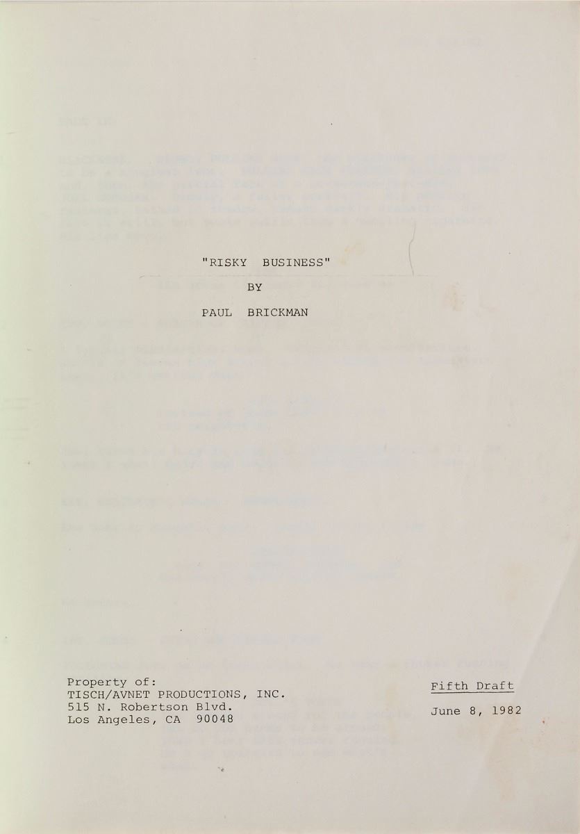 Brad-bound Tisch-Avnet Productions fifth draft screenplay of the 1983 film Risky Business, 8.75 x 11.25, 116 pages, dated June 8, 1982. The upper left corner of the front cover bears an ownership notation belonging to Steve Purcell, a member of the film’s special effects department. In very good condition, with moderate wear, especially to covers.