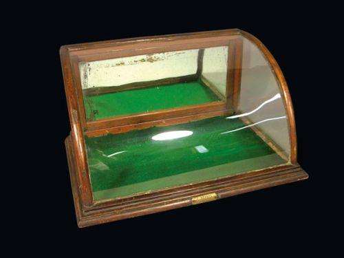 Riswig Curved Glass Showcase. Fair condition. 18 1/2 X 9 1/2 X 12 1/2 inches.