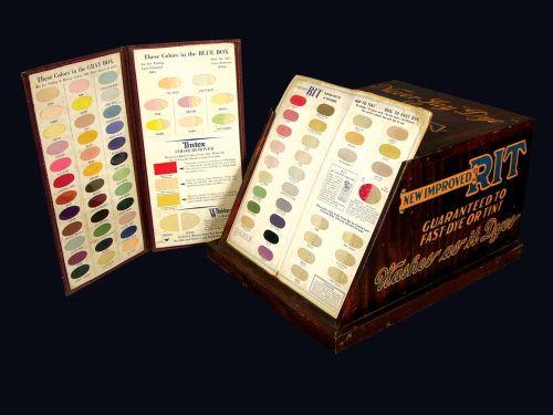 Rit Dye and Tint Tin Store Display includes 2 separate color charts. Minor edge ware otherwise excellent condition. 11 X 8 1/2 X 14 1/2 inches.