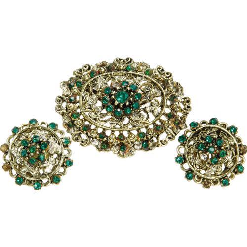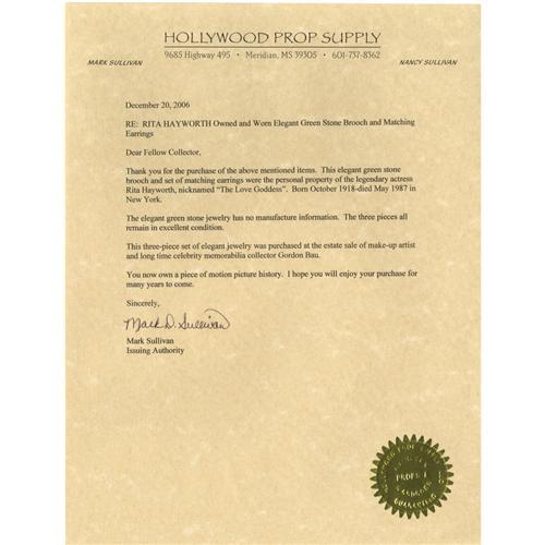 <B>Rita Hayworth Owned Brooch and Earrings.</B></I> A pair of brass earrings with green costume jewels and a matching brooch, owned and worn by Rita Hayworth. In Very Fine condition with some discoloration to a few of the stones on the brooch and one earring. <I>From the Gordon Bau Estate. Accompanied by LOA from Hollywood Prop Supply.</B></I><BR><BR><b>Shipping:</b> Clothing, Costumes & Jerseys (<a target="_blank" href="http://www.heritageauctions.com/common/shipping.php">view shipping information</a>)