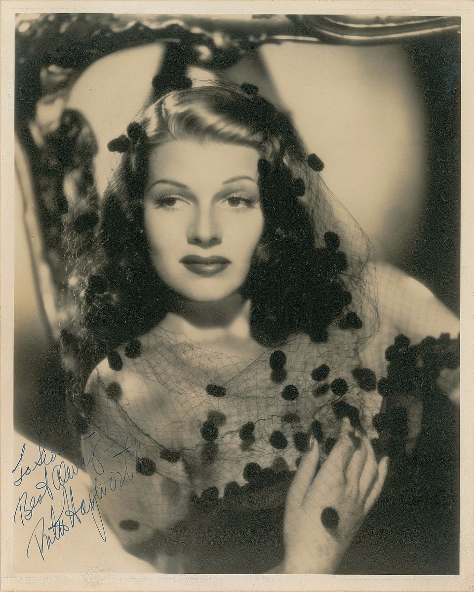 Stunning vintage matte-finish 8 x 10 photo of Hayworth in black lace and bathed in soft light, signed and inscribed in fountain pen, “To Sioma, Best always, Rita Hayworth.” In fine condition, with a couple areas of slight silvering.