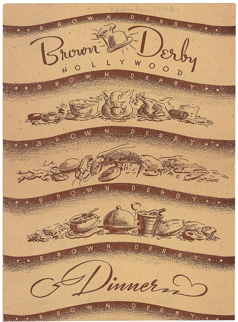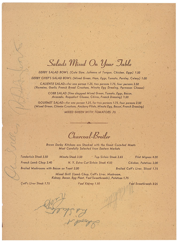 Original dinner menu from the Brown Derby restaurant, 9.5 x 13, signed vertically on the back cover in pencil by Rita Hayworth and Orson Welles. In fine condition, with central horizontal fold, two mild tears and a point of separation along the fold.