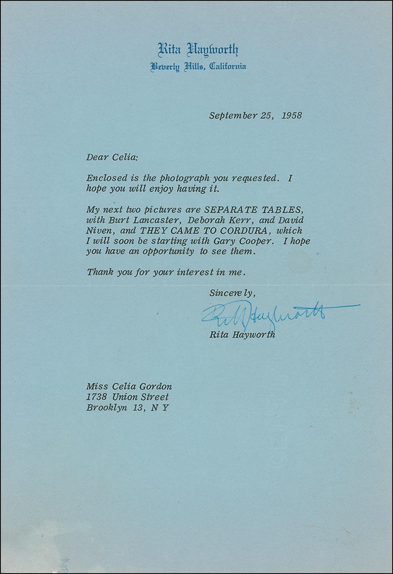 TLS, one page, 7 x 10.5, personal letterhead, September 25, 1958. In part: “My next two pictures are Separate Tables, with Burt Lancaster, Deborah Kerr, and David Niven, and They Came to Cordura, which I will soon be starting with Gary Cooper.” In fine condition, with soiling and light wrinkling to lower left corner.