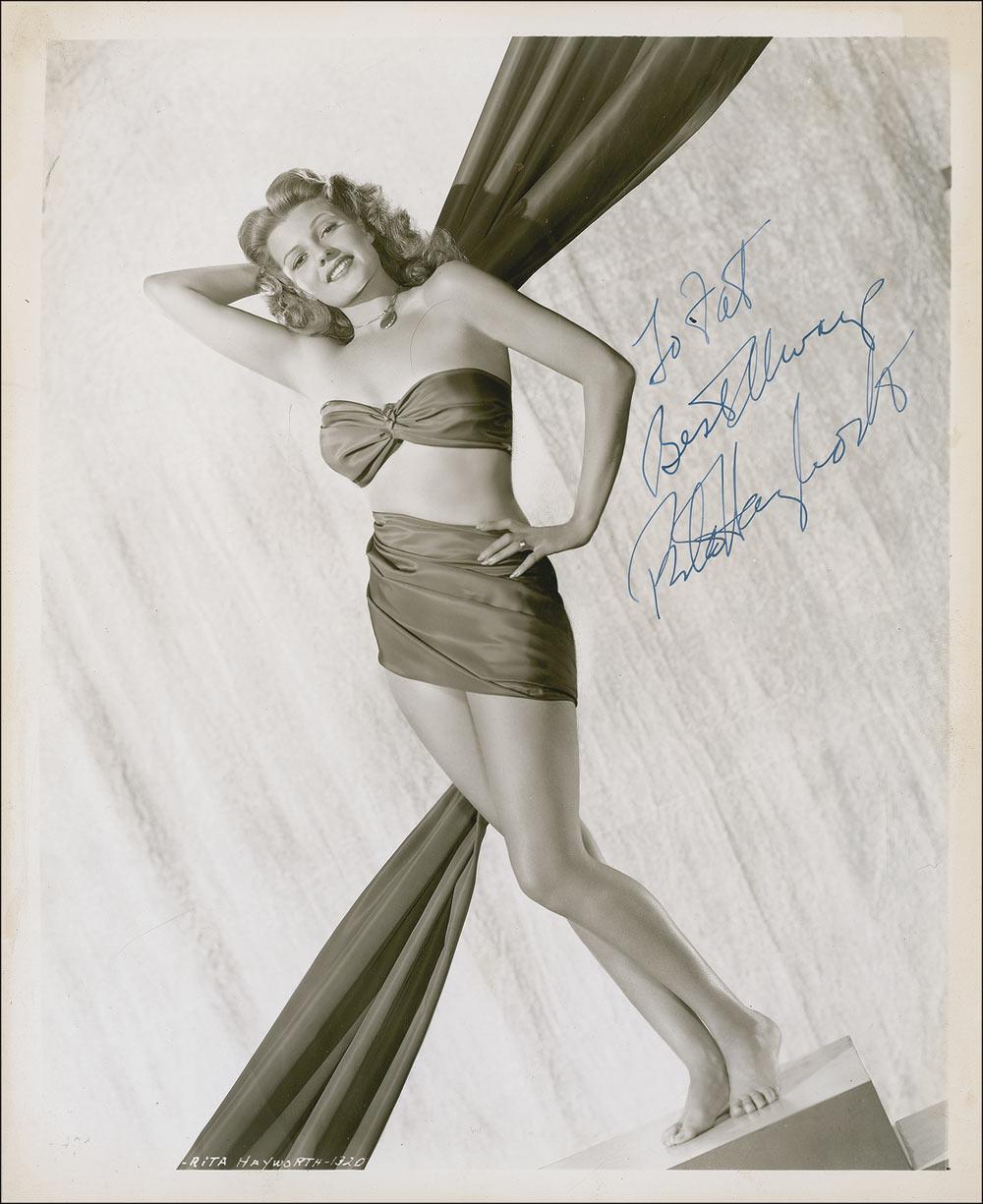 Eye-catching vintage glossy 8 x 10 full-length photo of Hayworth wearing a small top and a well-placed ribbon, signed and inscribed in blue ink “To Pat, Best always, Rita Hayworth.” In fine condition, with scattered light creases and surface marks, and some mild edge toning. A beautiful pose!