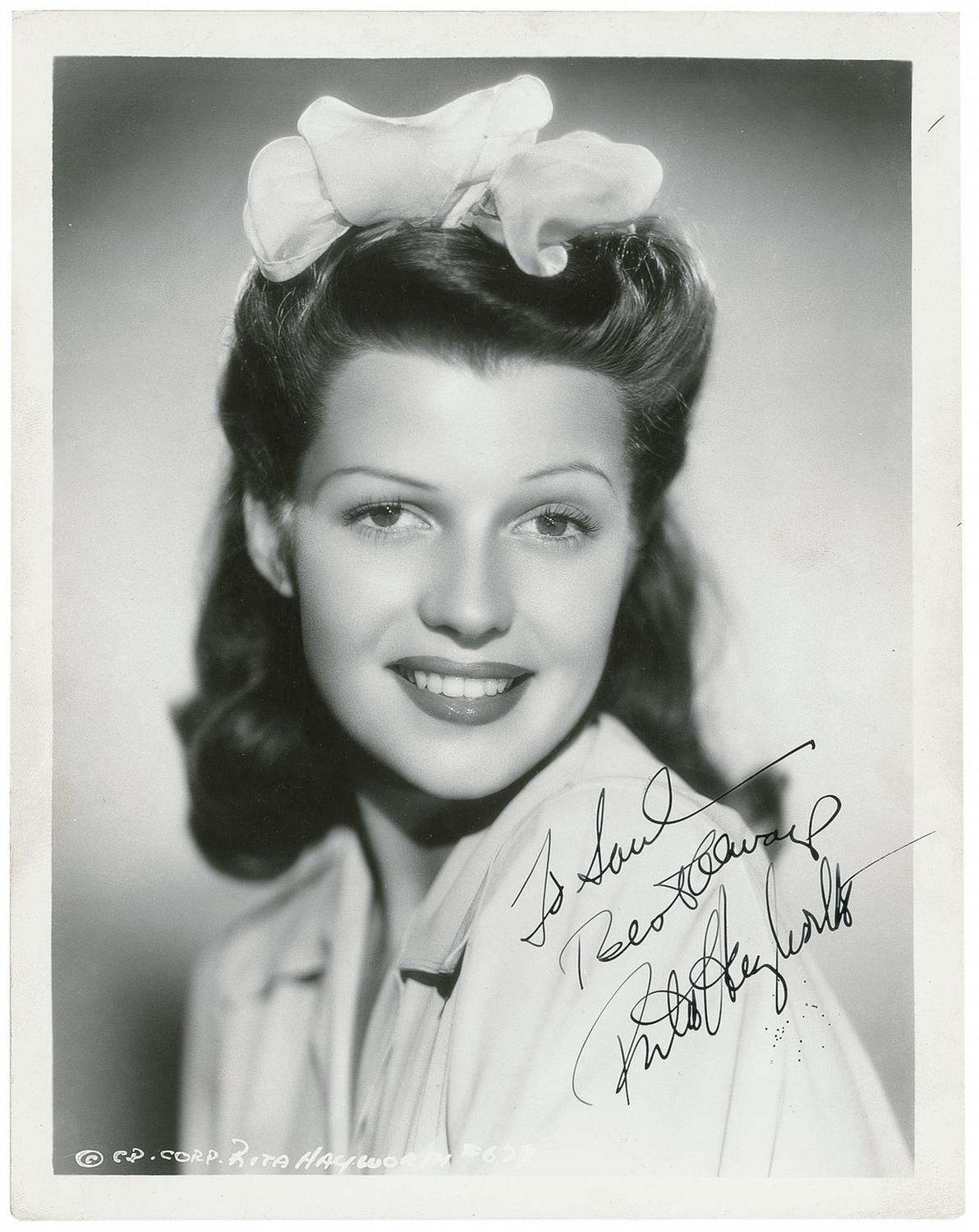 Lovely vintage glossy 8 x 10 photo, signed and inscribed in-person in fountain pen “To Saul, Best always, Rita Hayworth.” Reverse of photo bears collector’s ink date notation of June 23, 1943, the date the signature was acquired. In fine condition, with some stray ink flecks under signature, some scattered light surface marks and creases, and some light toning along left edge. The year after signing this photo, Hayworth would be named one of the top box office attractions for the next three years. Saul Goodman Collection.