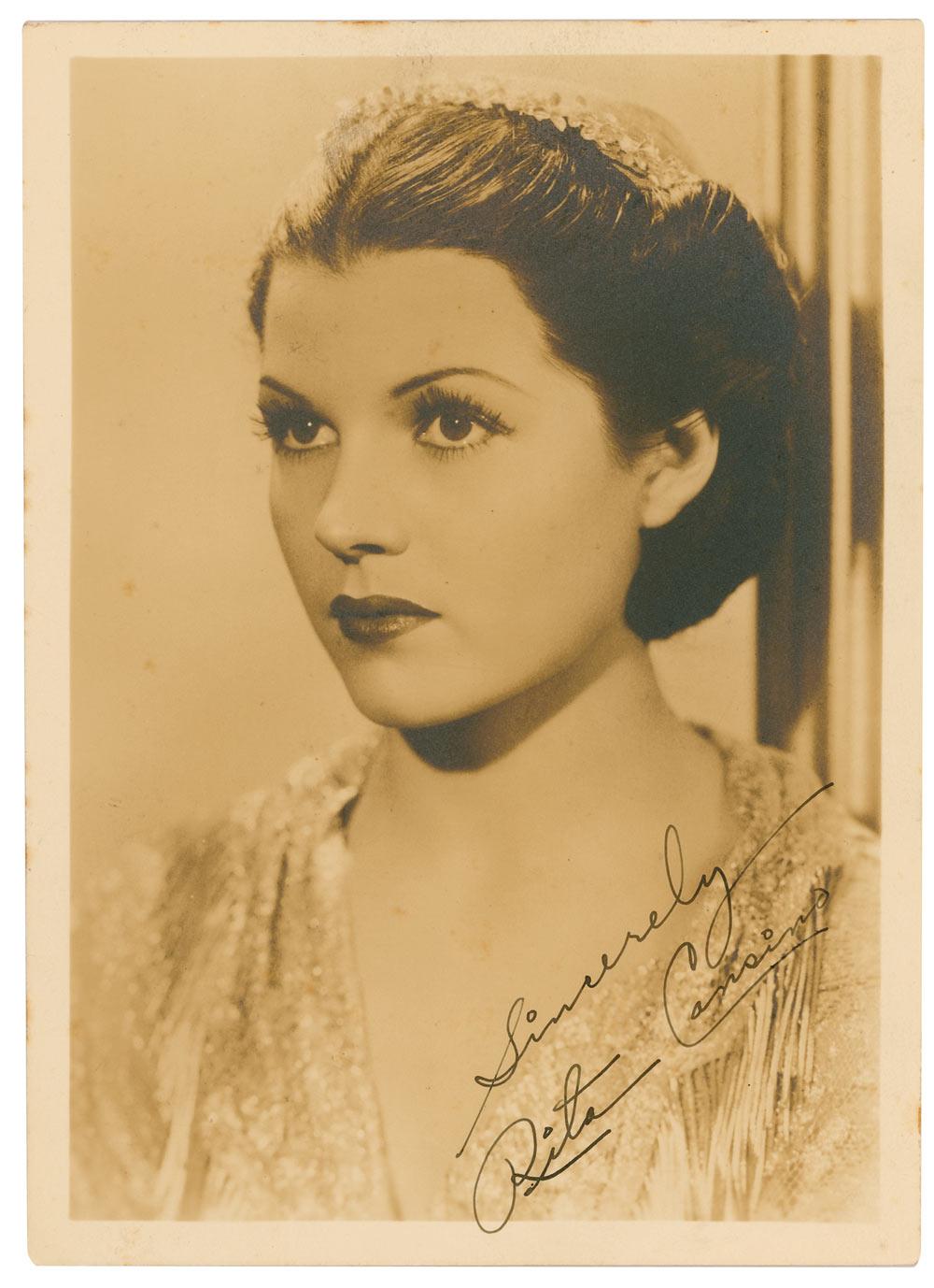 Early vintage matte-finish 5 x 7 Fox Studios publicity photo, signed in fountain pen “Sincerely, Rita Cansino.” In fine condition, with a few spots of toning and silvering to some of the darker portions. Fox Film signed a teenaged Margarita ‘Rita’ Cansino to a long-term contract following her appearance in ‘Dante’s Inferno.’ She adopted her familiar stage name (which was adapted from her mother’s maiden name) soon after her move to Columbia Pictures in 1937. Accompanied by the original mailing envelope. Anything signed by Hayworth as Rita Cansino is scarce and highly collectible.
