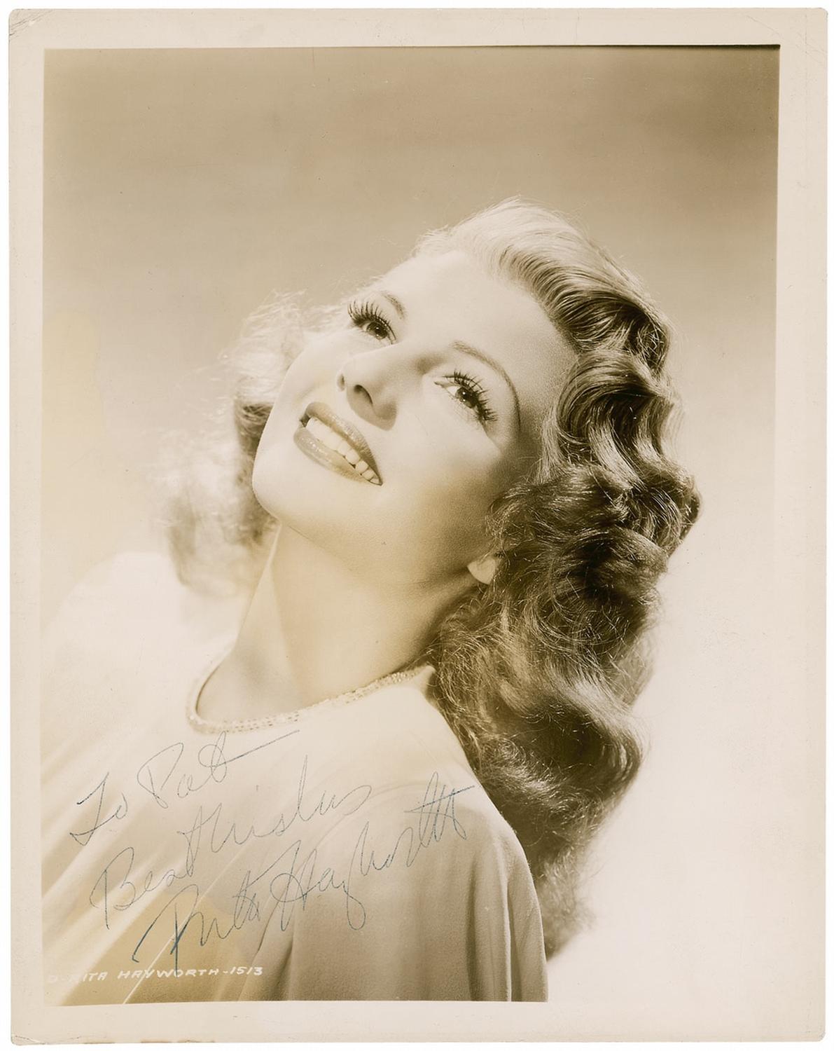 Vintage glossy 8 x 10 Columbia Pictures promotional photo, with official Columbia stampings on the verso, signed and inscribed in blue ballpoint, “To Pat, Best Wishes, Rita Hayworth.” In very good to fine condition, with scattered small creases, areas of faint discoloration to image, and uniform irregular ink adhesion to signature. Despite its flaws, a great, lesser-seen image from the sexy starlet’s peak of fame.