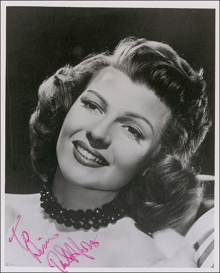 Attractive glossy 8 x 10 head-and-shoulders photo of the smiling actress, signed and inscribed in pink felt tip, “To Brian, Rita Hayworth.” In fine condition, with some scattered light creases. Accompanied by a full letter of authenticity from PSA/DNA.