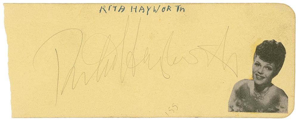 Vintage pencil signature, “Rita Hayworth,” on a yellow 5.5 x 2 album page, with a small clipped photo affixed to right side and collector’s notation along top. In fine condition, with some scattered light soiling, small fingerprint, and signature a shade light.