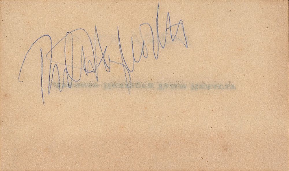 Vintage ballpoint signature, “Rita Hayworth,” on an off-white 3.75 x 2 slip. In fine condition, with some light scattered foxing and show-through from printed text to the reverse.