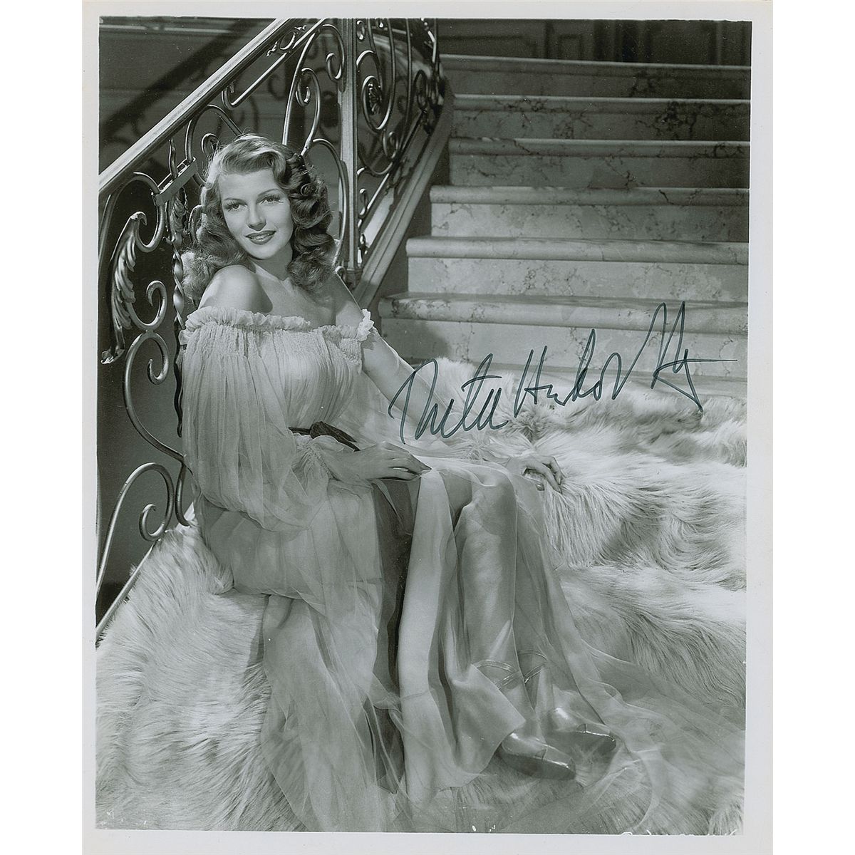 Glossy 8 x 10 photo of Hayworth as she appeared in Gilda, clad in a nightgown and sitting on a fur-draped staircase, signed in black felt tip. In fine condition. From one of her most iconic films, this photo is the only example of this pose that we have ever offered.