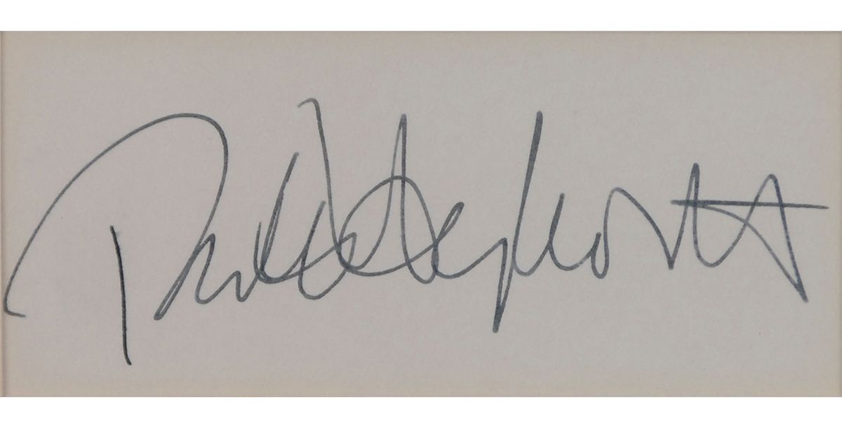 Ballpoint signature, “Rita Hayworth,” on an off-white card. Matted and framed with a glamorous color photo of Hayworth lounging on a couch to an overall size of 19 x 17.25. In fine condition.