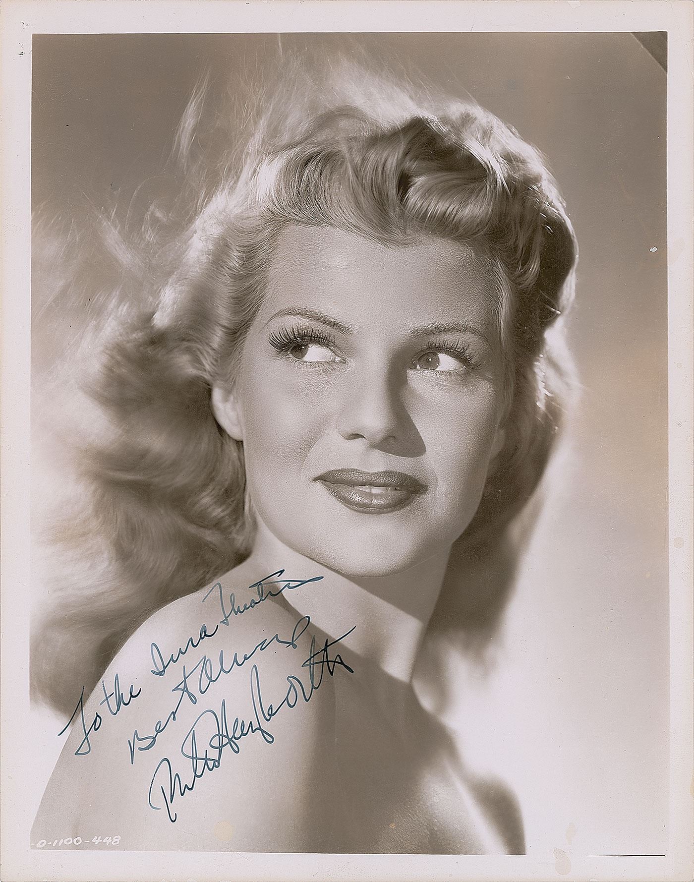 Beautiful vintage glossy 8 x 10 publicity photo of Hayworth for her 1947 film Down to Earth, boldly signed and inscribed in fountain pen, "To the Jura Theatre, Best Always, Rita Hayworth.” In fine condition, with scattered light creasing. A stunning portrait of the acclaimed starlet.