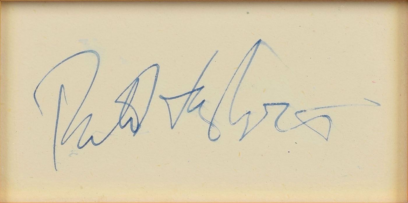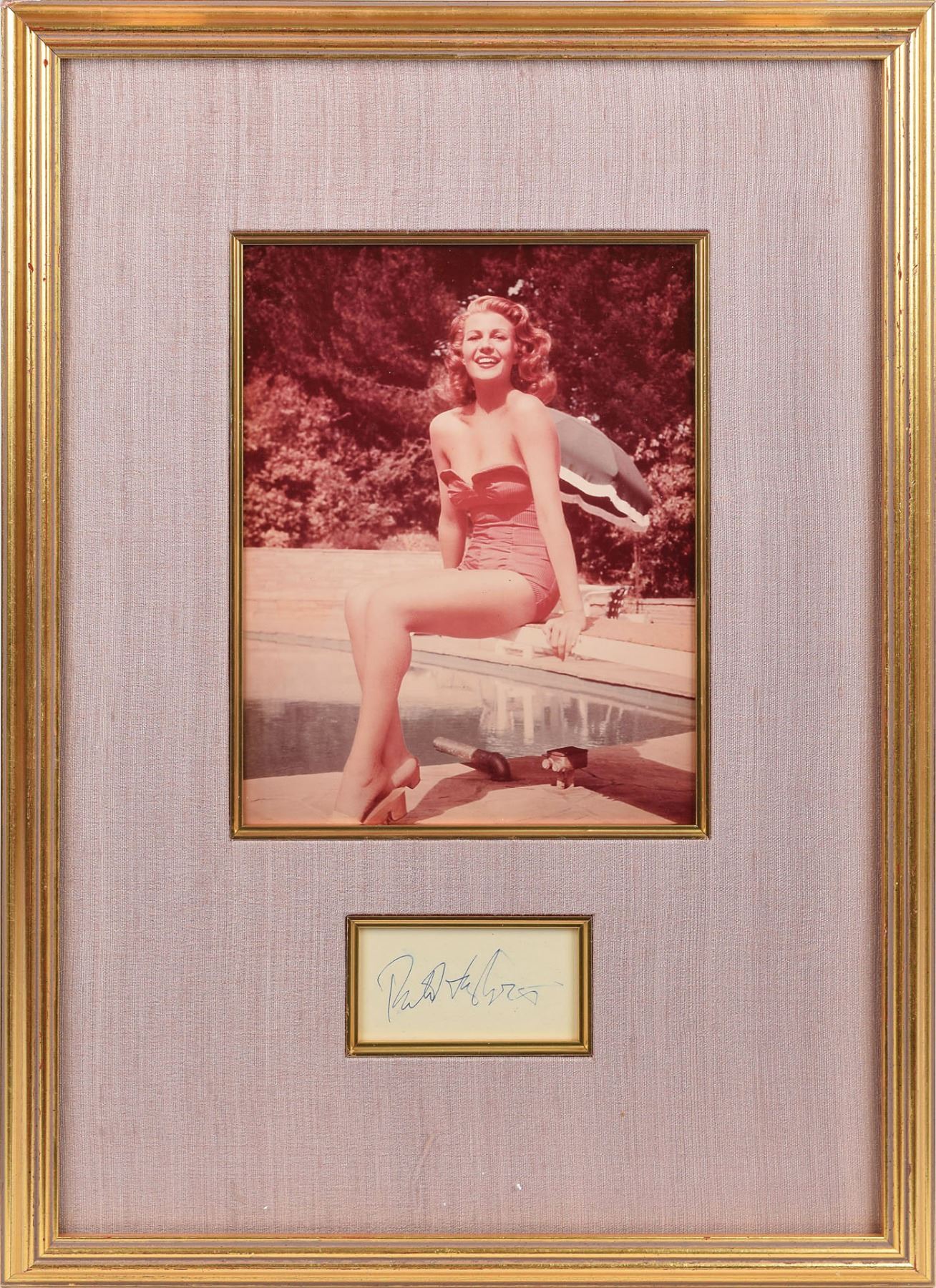 Vintage fountain pen signature, "Rita Hayworth,” on an off-white 3.5 x 1.75 slip. Attractively cloth-matted and framed with a portrait to an overall size of 15.5 x 21.5. In fine condition, with light brushing to the rapid signature.