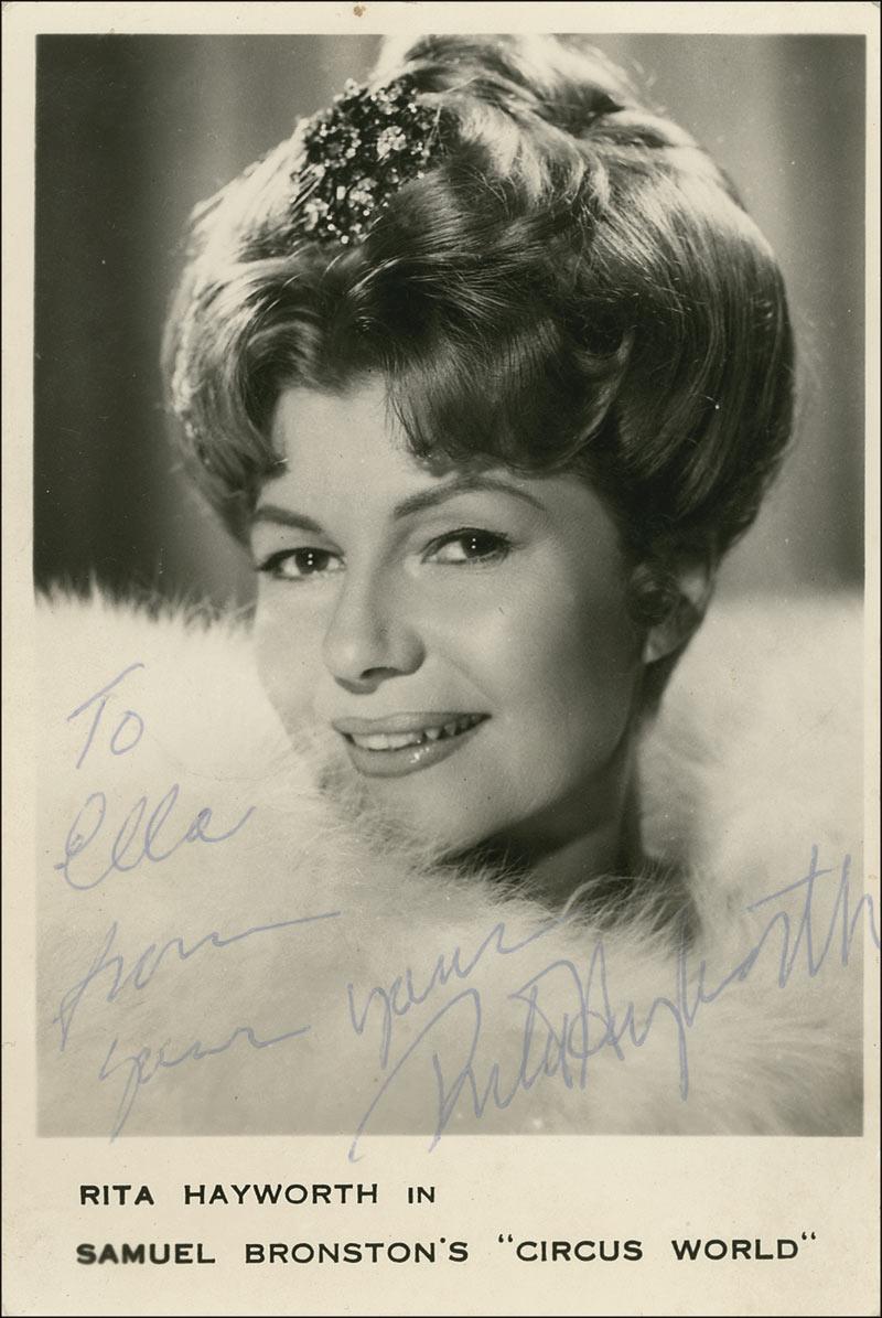 Vintage 4 x 5.75 promotional photo of Hayworth for Circus World, signed and inscribed in blue ballpoint “To Ella from your your [sic], Rita Hayworth.” In fine condition, with a bit of light border soiling, and a small crease next to inscription. Pre-certified PSA/DNA and RRAuction COA.