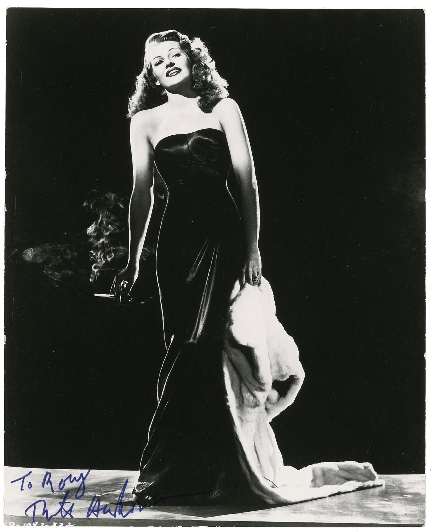 Glamorous glossy 8 x 10 full-length photo of Hayworth holding a smoldering cigarette, signed and inscribed in blue felt tip “To Rory, Rita Hayworth.” In very good condition, with scattered creases, surface marks, and impressions, and dings to left edge. Pre-certified PSA/DNA and RRAuction COA.