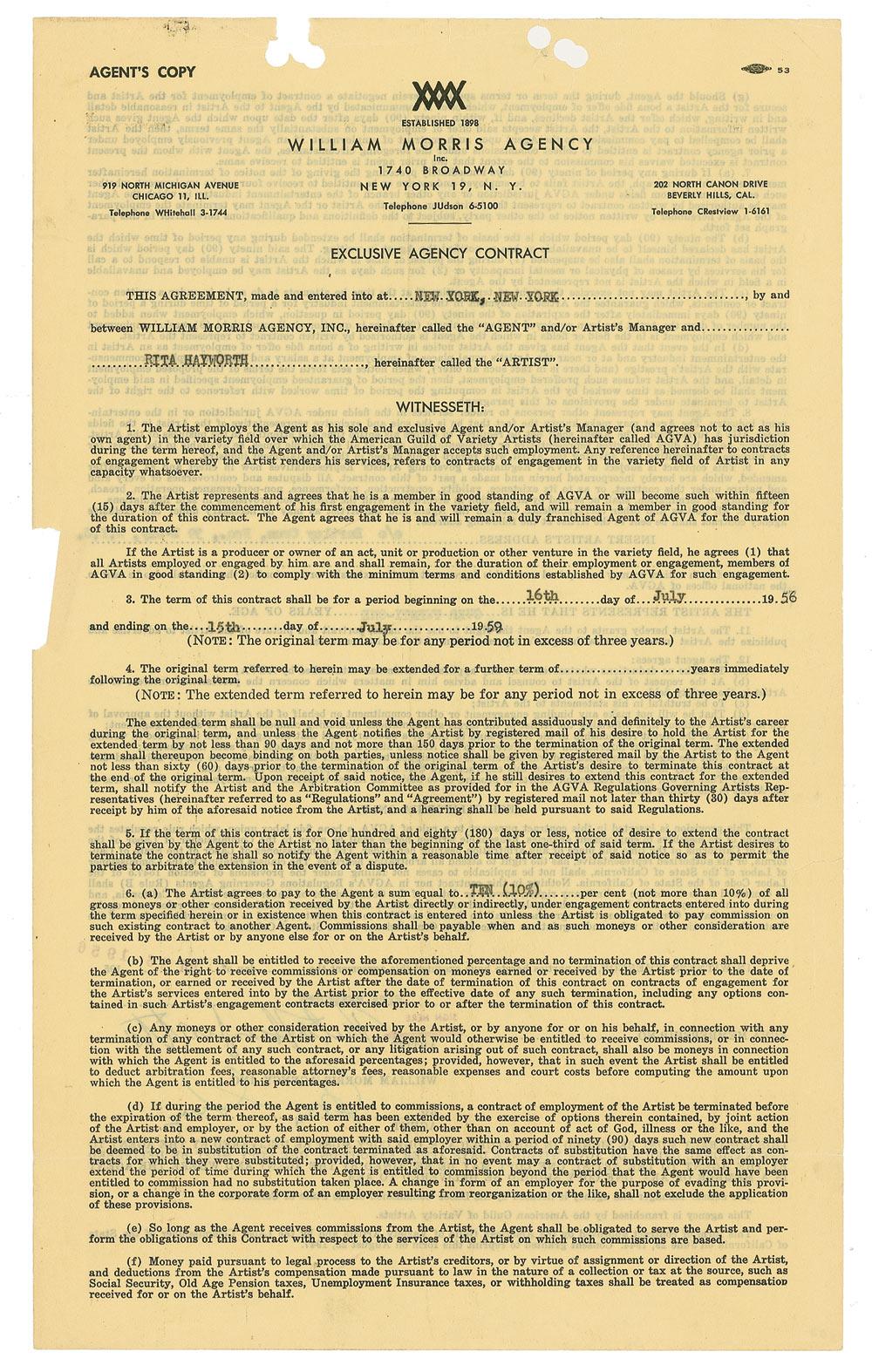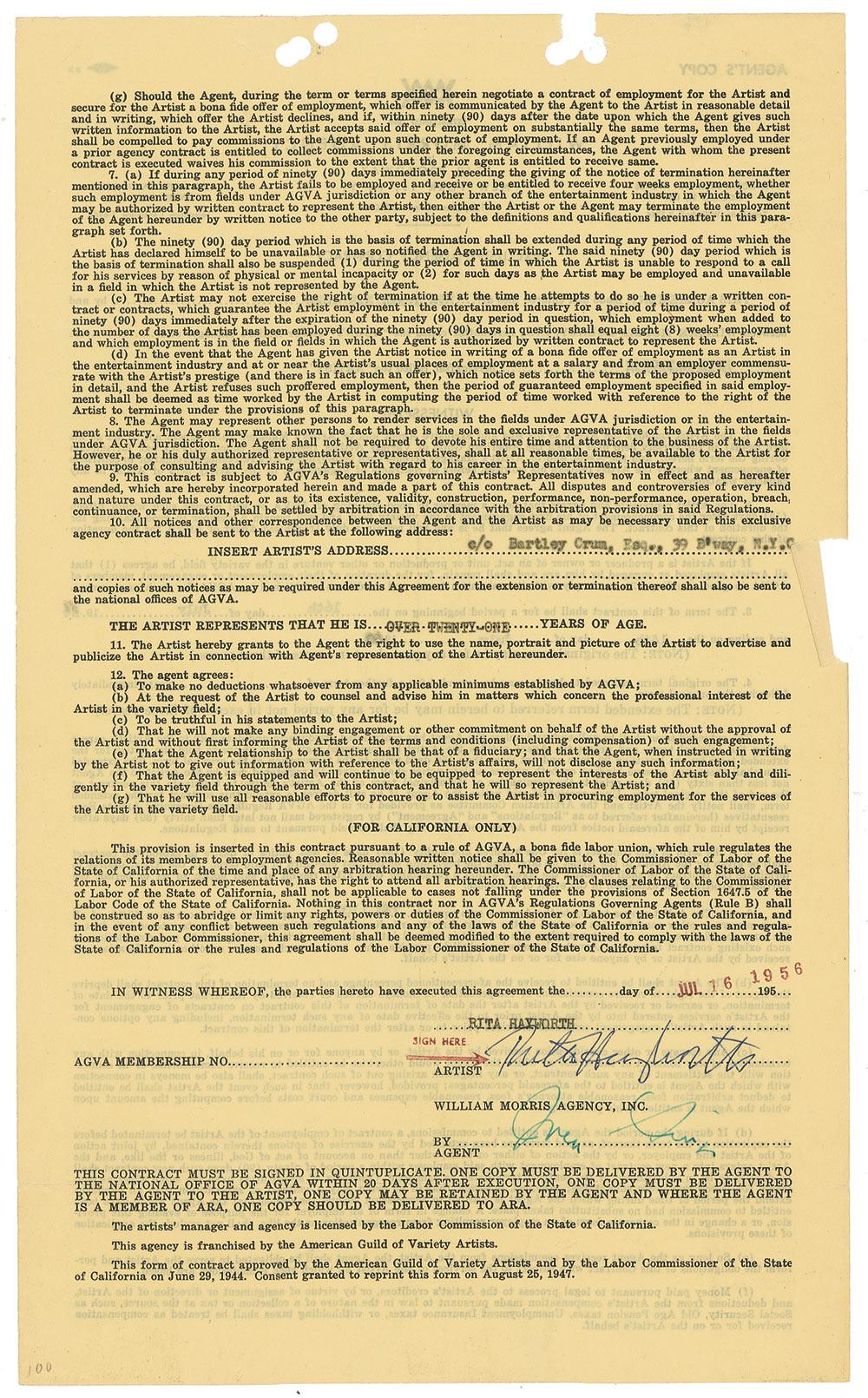 DS, one page both sides, 8.5 x 14, stamp-dated June 16, 1956. Exclusive four-year agency contract between Hayworth and the William Morris Agency for the standard ten percent commission. Signed on the reverse in blue ink by Hayworth. Vertical fold near bottom, a couple of edge tears, and torn punch holes to top, otherwise fine condition. The signature is unaffected by any of the flaws. Pre-certified PSA/DNA and RRAuction COA.