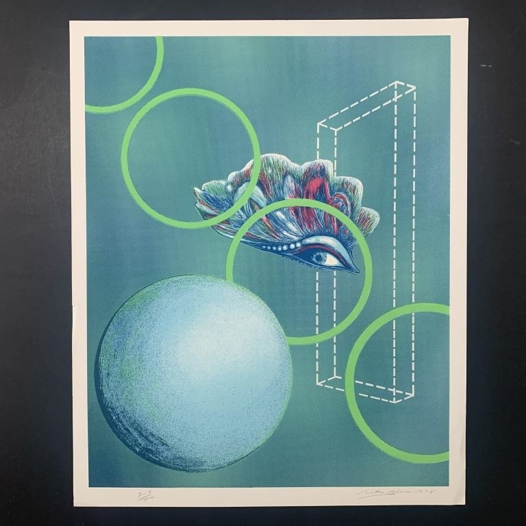 Rita Simon's "Reflected Landscape" limited edition print, signed lower right, and numbered 77/300 lower left. This is an abstract piece depicting a bird's eye, and circles. This piece is in fair condition, with two small incisions at left, and two at right.
