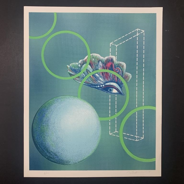 Rita Simon's "Reflected Landscape" limited edition print, signed lower right, and numbered 77/300 lower left. This is an abstract piece depicting a bird's eye, and circles. This piece is in fair condition, with two small incisions at left, and two at right.