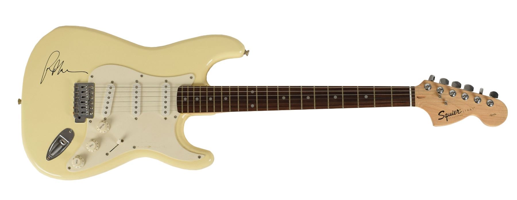 Cream-bodied Affinity series Fender Squier Stratocaster electric guitar, signed on the body in black felt tip by Blackmore. In fine condition, with a small chip and trivial scuffs to body, in no way affecting signature or display value. Accompanied by a black Fender gig bag. An appreciably bold signature that contrasts nicely against the instrument’s light-colored frame. Originally obtained by in-person specialist Mike Wehrmann.