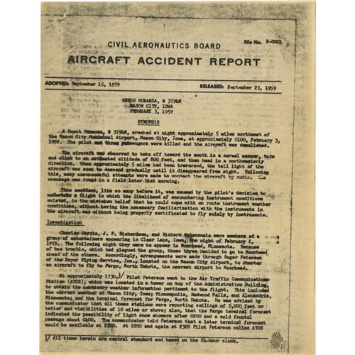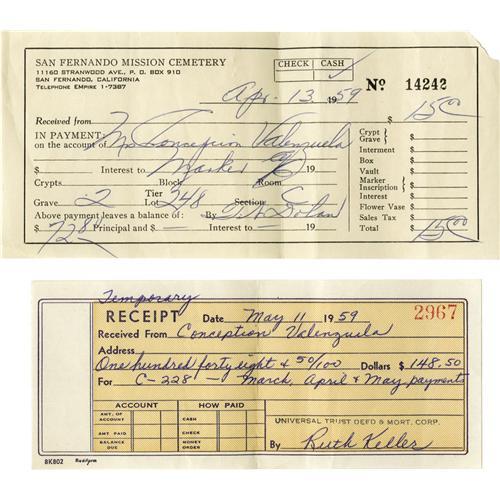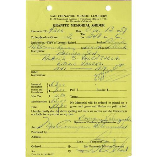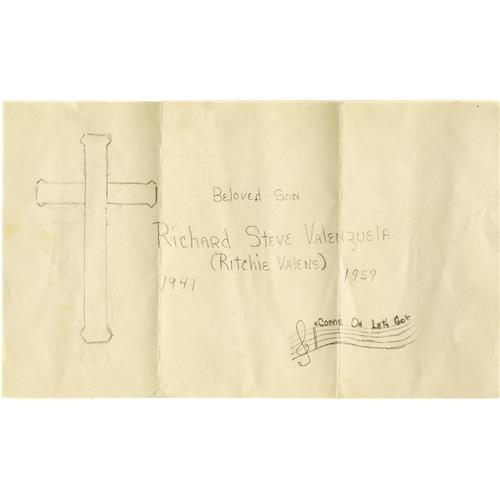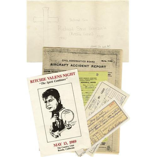 <B>Ritchie Valens Funeral Lot.</B></I> In the early morning hours following a February 2, 1959 performance at the Surf Ballroom in Clear Lake, Iowa, a small four-passenger Beechcraft Bonanza aircraft departed into a blinding snowstorm and crashed into a cornfield several miles after takeoff. The crash killed Ritchie Valens, Buddy Holly, J. P. "The Big Bopper" Richardson, and pilot Roger Peterson, and later became immortalized as "The Day the Music Died." This lot includes a copy of the nine-page report on the accident filed by the Civil Aeronautics Board, a receipt and hand-drawn design for Valens headstone, receipts for the funeral arrangements, and a program for the May 13, 1989 memorial "Richie Valens Night" celebration. All items are in overall Very Good to Excellent condition.