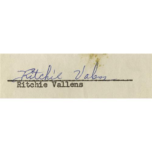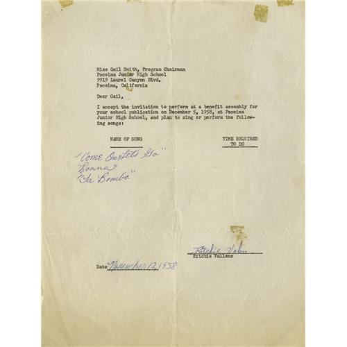 <B>Ritchie Valens Signed Agreement with Song Titles.</B></I> Dated November 12, 1958, this one-page, typed agreement reads: "Dear Gail, I accept the invitation to perform at a benefit assembly for your school publication on December 5, 1958, at Pacoima Junior High School, and plan to sing or perform the following songs:" with the titles "Come On, Let's Go," "Donna," and "La Bomba" handwritten by Valens and his signature near the bottom in blue ink. Valens had been a student at the school, where he gave regular performances during his lunch breaks, and word of the talented young singer eventually reached Del-Fi Records owner and president Bob Keane, who quickly signed and recorded the future star. Sadly, it wasn't long after this show when Valens, age 17, died in the February 3, 1959 plane crash that also claimed the lives of J. P. "Big Bopper" Richardson and Buddy Holly. In Very Fine condition with mild tanning, several fold creases, very faint soiling and a few tape stains. <I>With COA from PSA/DNA.</B></I>
