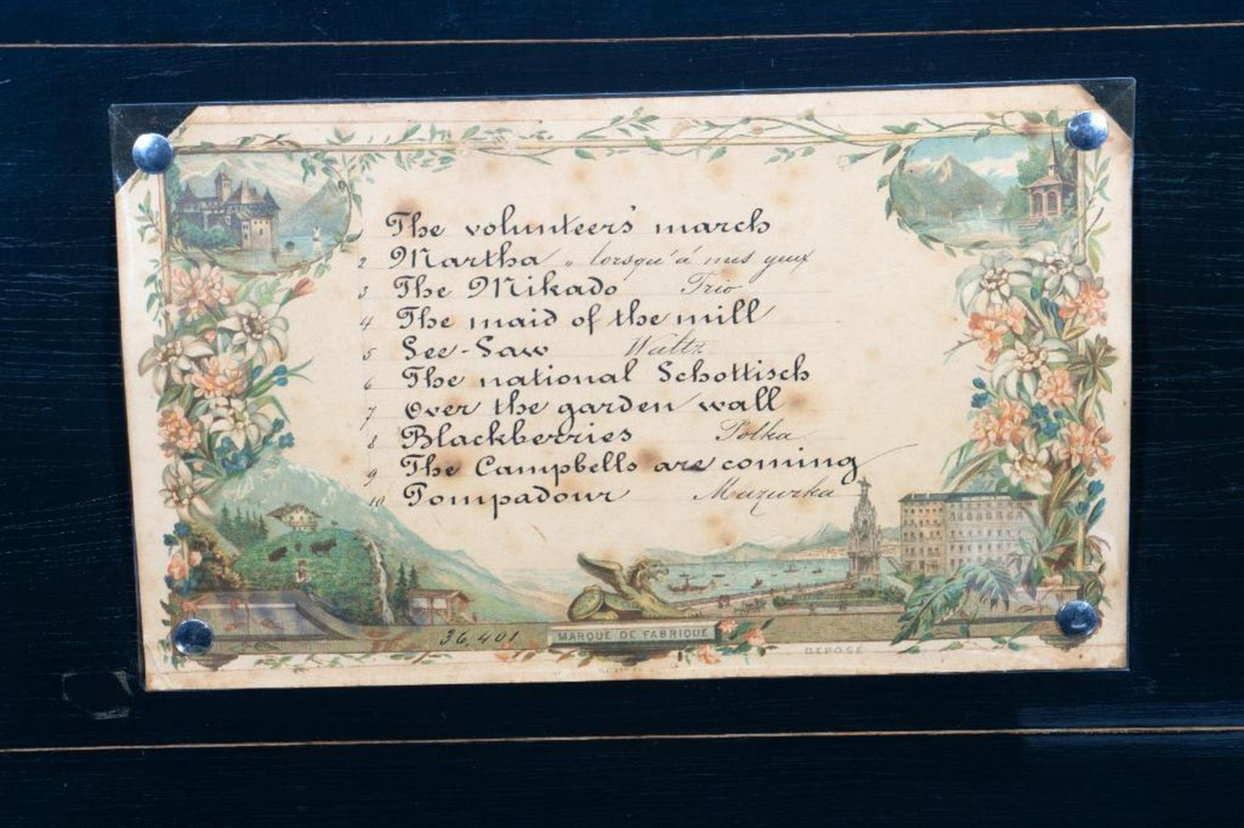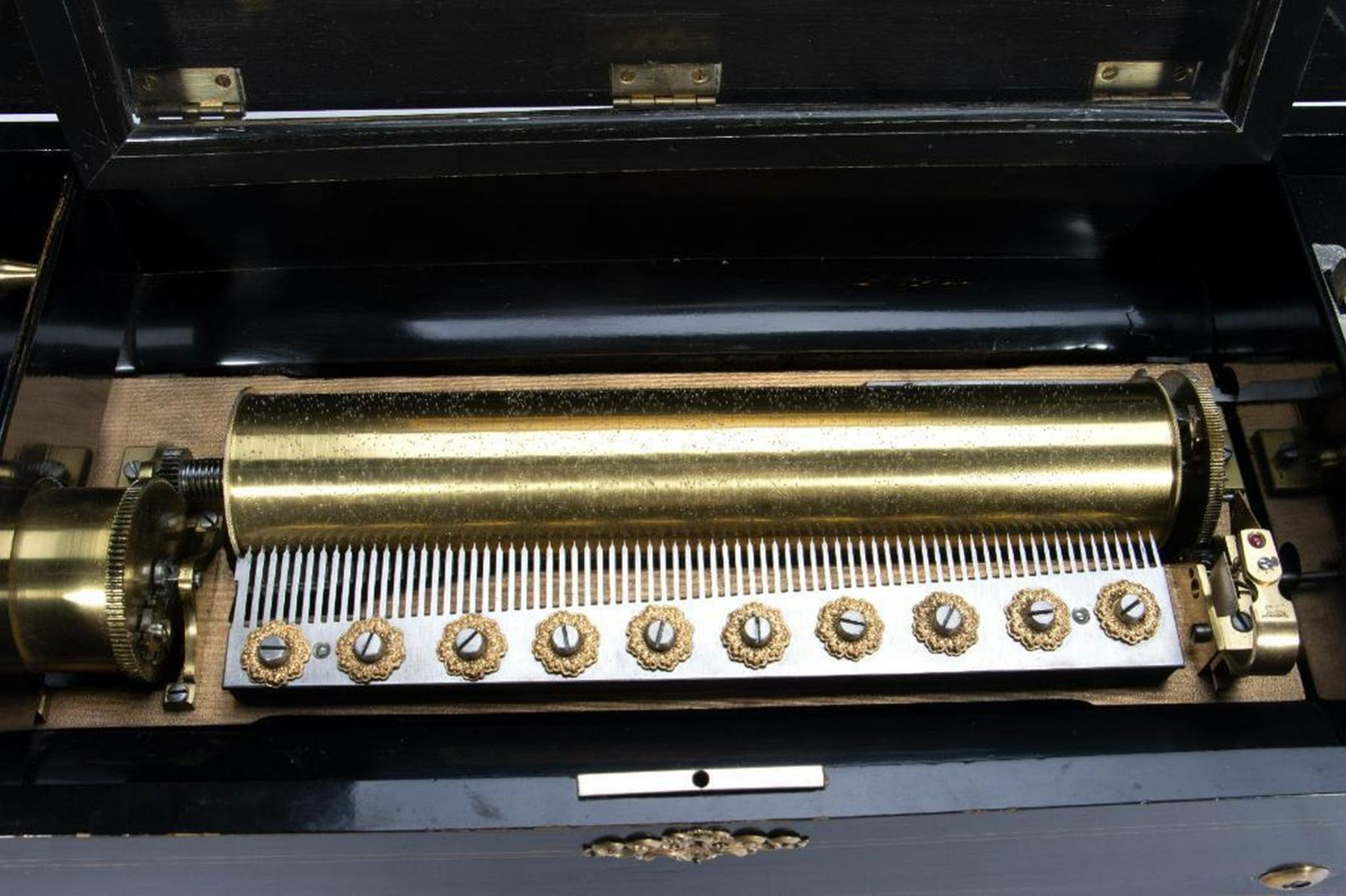Geneva, Circa 1875. Made for the Scottish Market, playing ten songs. According to the accompanying documents it was restored in 1989. Contained in an inlaid box. 8in. h. 24in. l 11in. d. Good condition; some small/minor scratches to box. Note: Heavy for shipping.