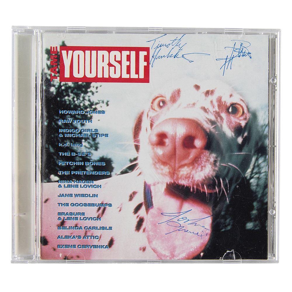 Tame Yourself CD signed on the front of the booklet in blue ballpoint by River Phoenix, Tim Hankins, and Josh Greenbaum. In fine condition. The CD is included. The three were part of the Gainesville folk-rock group Aleka's Attic, whose song 'Across the Way' appears on this compilation album.