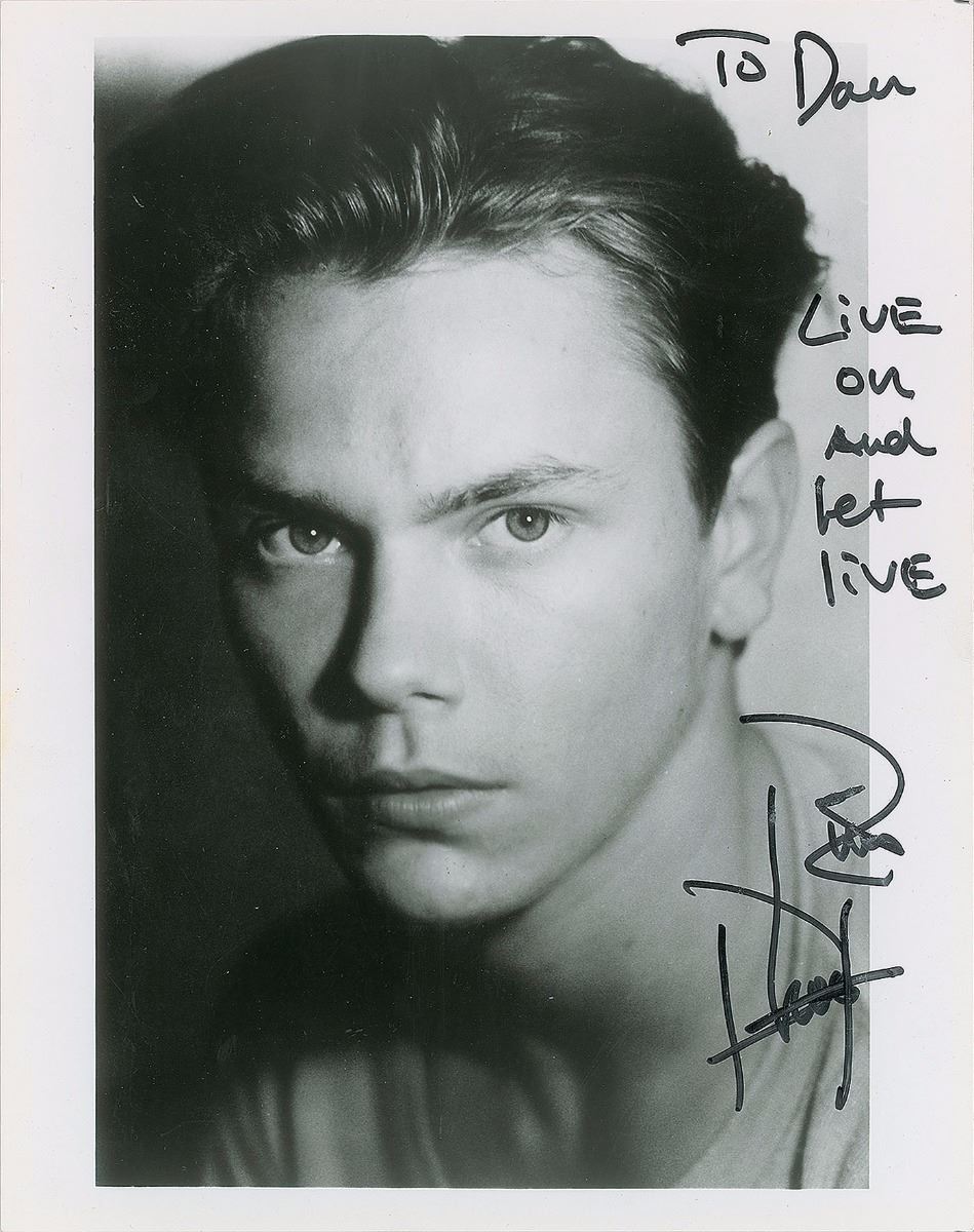 Uncommon glossy 8 x 10 photo of the young actor, signed and inscribed in black felt tip, “To Dan, Live on and let live, River Phoenix.” In fine condition, with some small surface dings.