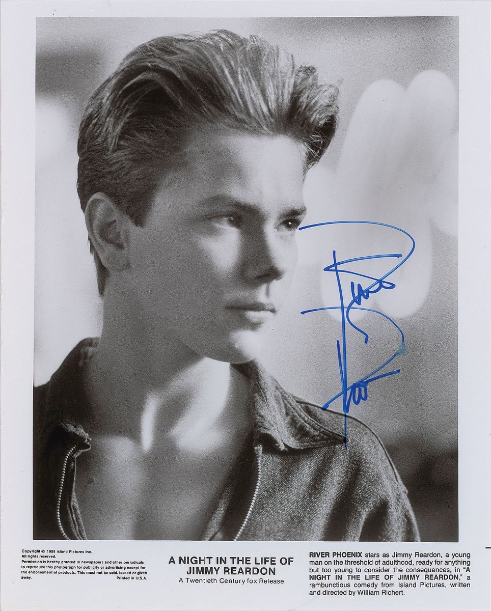 Scarce glossy 8 x 10 Twentieth Century Fox publicity photo of Rivers as the titular character from the 1988 film A Night in the Life of Jimmy Reardon, signed in blue felt tip. In fine condition.