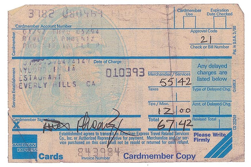 American Express credit card receipt in the amount of $67.42, one page, 4.75 x 3.25, signed at the conclusion in black ballpoint by River Phoenix. In very good to fine condition, with light soiling and a vertical fold.