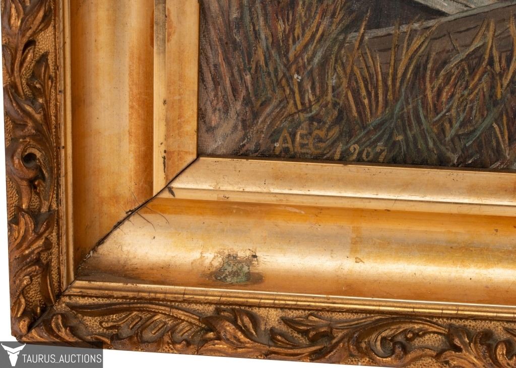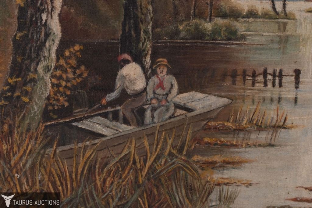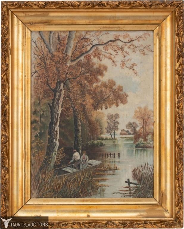Item/Description: Antique gilt framed oil painting features a couple in a row boat on a tree lined river or stream. Signed and dated lower left with the artists monogram: AEG 1907. Unknown artist.