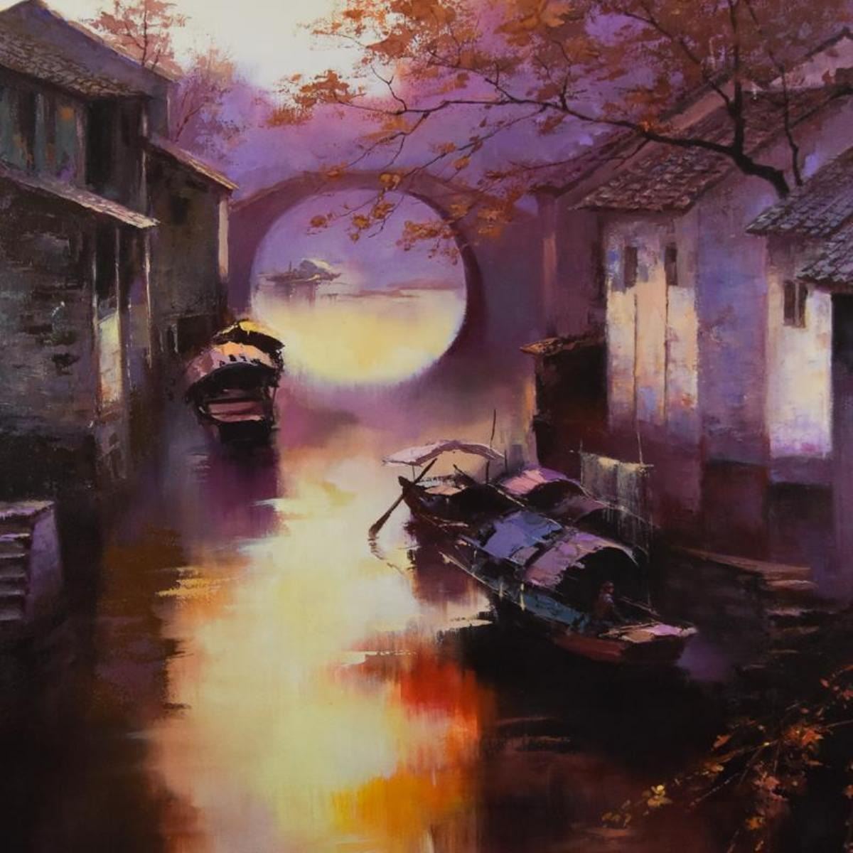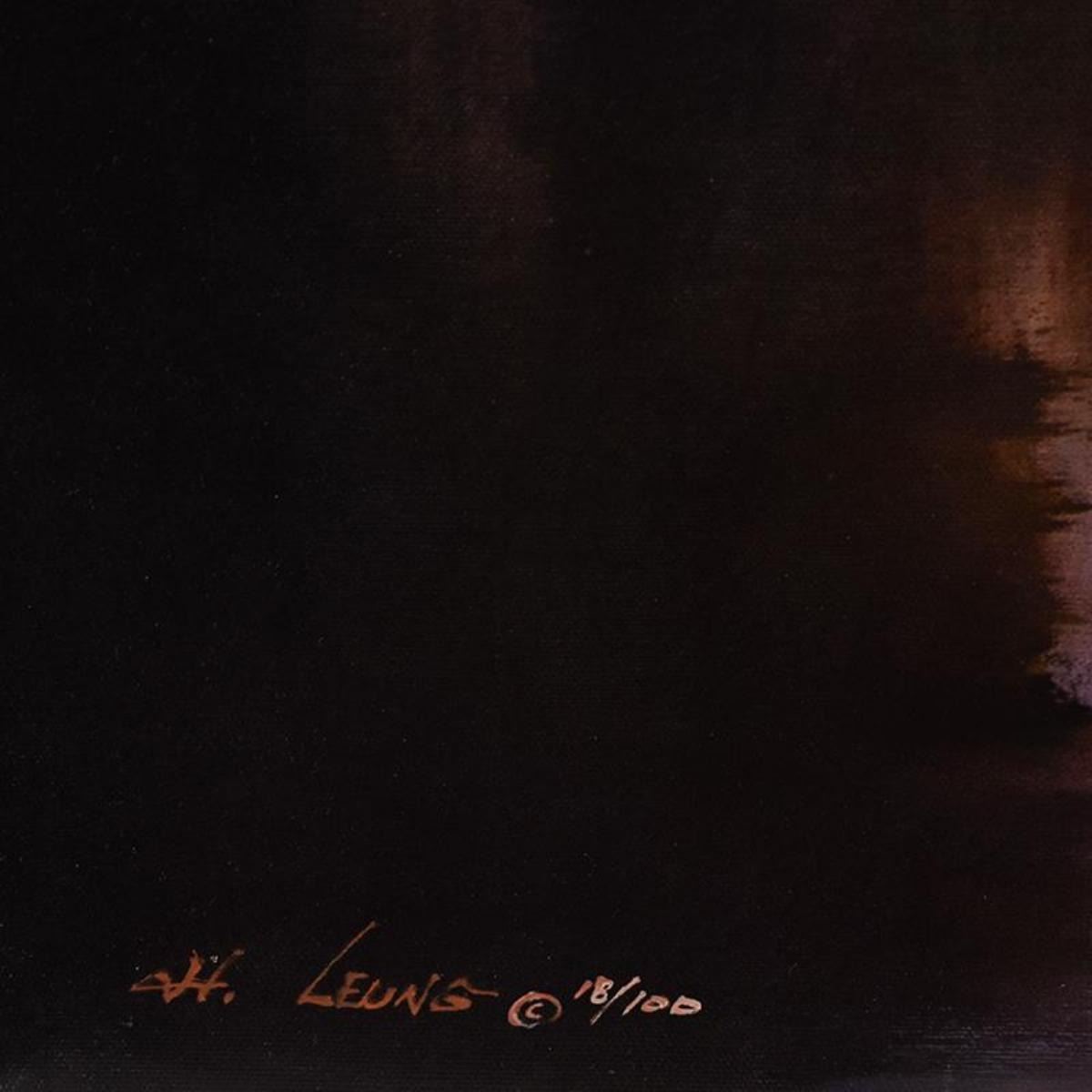 "River Twilight" is a hand embellished limited edition giclee on canvas by H. Leung, numbered 18/100 and hand signed by the artist. Includes Letter of Authenticity. Measures approx. 36" x 47.5" (image). ** Please note: there are several minor scuffs on the image. **