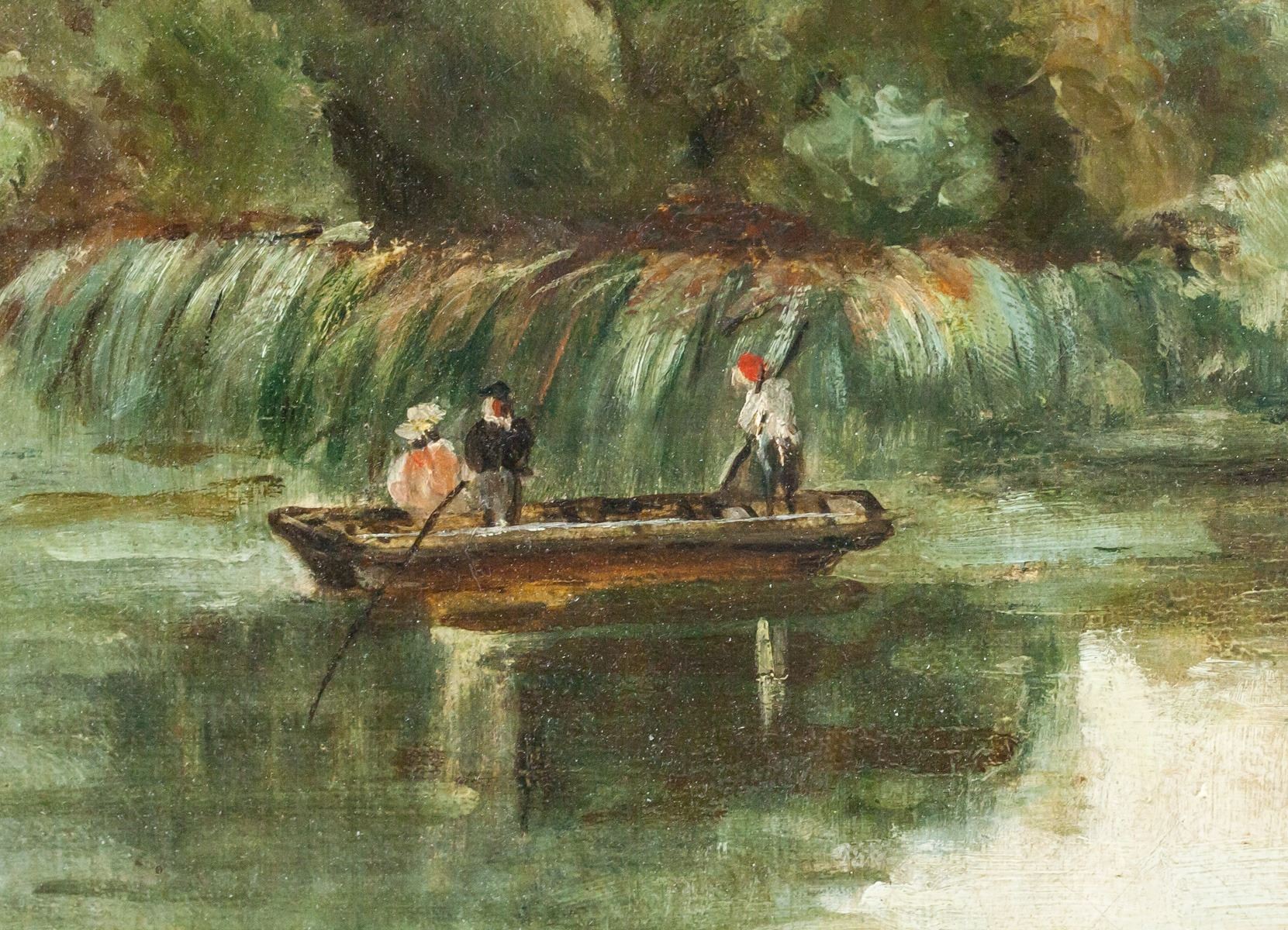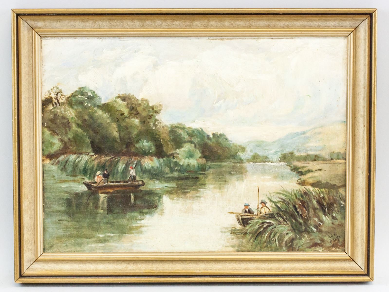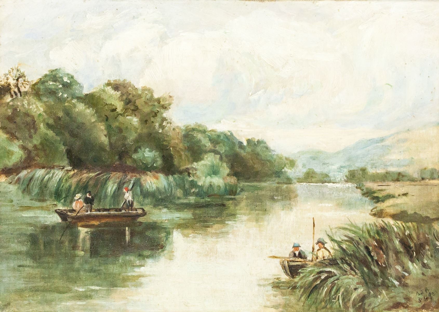 Oil on canvas, framed. Featuring river scene with two small boats being poled down the river. Signed "A. J. B" in the bottom right corner with "90" inscribed below. Stamped illegibly on verso. 25 x 34 cm (10 x 13 inches), Frame: 32 x 42 cm (12.5 x 18.5 inches)
