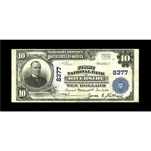 <B>Riverside, CA</B></I> - $10 1902 Plain Back Fr. 626 <B>First NB</B></I> Ch. # 8377<BR>A strong <B>Very Fine+</B></I> with the officers' ink signatures as strong as the day they signed. This addition to the census is only the sixth $10 Plain Back to surface bearing this title. An attractive addition to any California collection.<BR><BR><b>Shipping:</b> Coin/Currency (<a target="_blank" href="http://www.heritageauctions.com/common/shipping.php">view shipping information</a>)