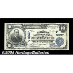 Riverside, CA - $10 1902 Plain Back Fr. 626 The Citizens NB Ch. # (P)8907A very scarce and seldom available bank in large size, particularly in nice grade, which this example most assuredly is. Bright Very Fine, with clear signatures, as nice as any example from here we've seen previously and considerably better than even the Colver specimen. <BR><BR><B>Important notice:</B> Heritage usually auctions material at the rate of 200-250 lots per hour. On some occasions eBay Live bid software or the Internet may not be able to keep up with the pace of the auction. We recommend placing a realistic absentee bid now as insurance to avoid disappointment. Occasionally the auctioneer may eliminate or reject an eBay Live bid, and the auctioneer may also reopen a lot after the close of the eBay live bidding (usually because we missed an audience bid), and may reject your bid even if it shows you as the winning bidder. By bidding via eBay Live, you agree that Heritage may award the lot to another bidder at its sole discretion under the circumstances described above or any other reasonable circumstances. Since eBay bids are not shown to us until we open the lot on the floor, we treat those bids just like floor bids. In most cases the floor responds before the eBay bid is presented to us, due to Internet lag time, so for consistency we have made it a policy that floor bids are always considered first over tie eBay live bids. Also please note that all Heritage lots purchased through eBay Live carry a 20% Buyer's Premium. Please make sure you read the Terms and Conditions before you bid. <BR><BR><B>IMPORTANT ANNOUNCEMENT ABOUT RESERVES:</B> Heritage now divulges all reserves on its web site 7 days before every auction. If you want to know whether the reserve on this lot has been met, and if not, what the reserve amount is, please visit this lot page on the HeritageCoin.com web site, or email: bid@HeritageGalleries.com
